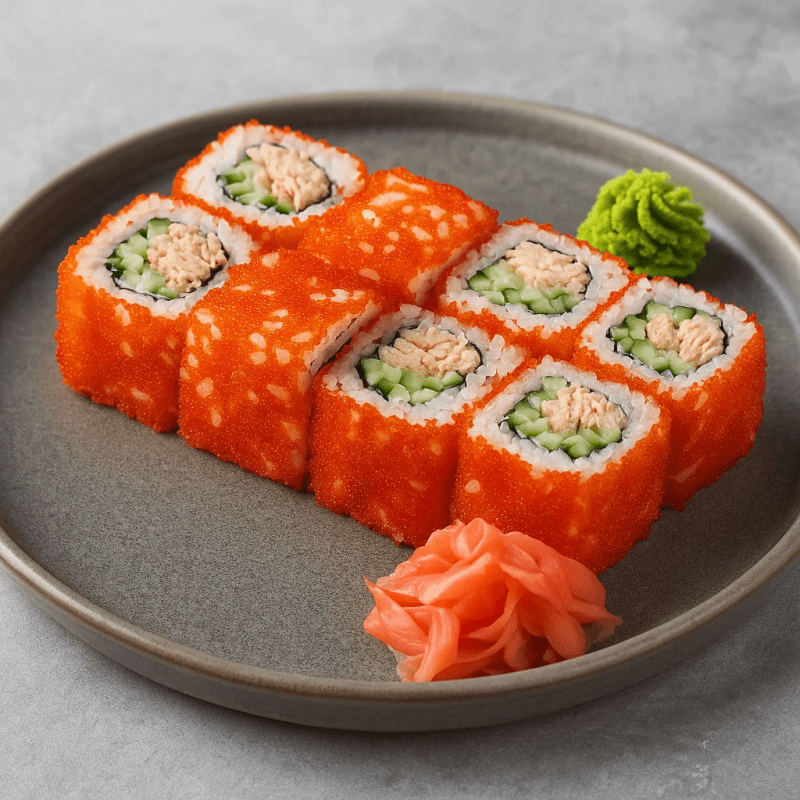 Состав: Рис, жареный лосось, огурец, майонез, тобико