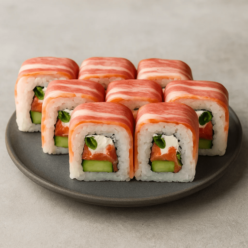 Состав: Рис, Копченый лосось, огурец, сыр, бекон