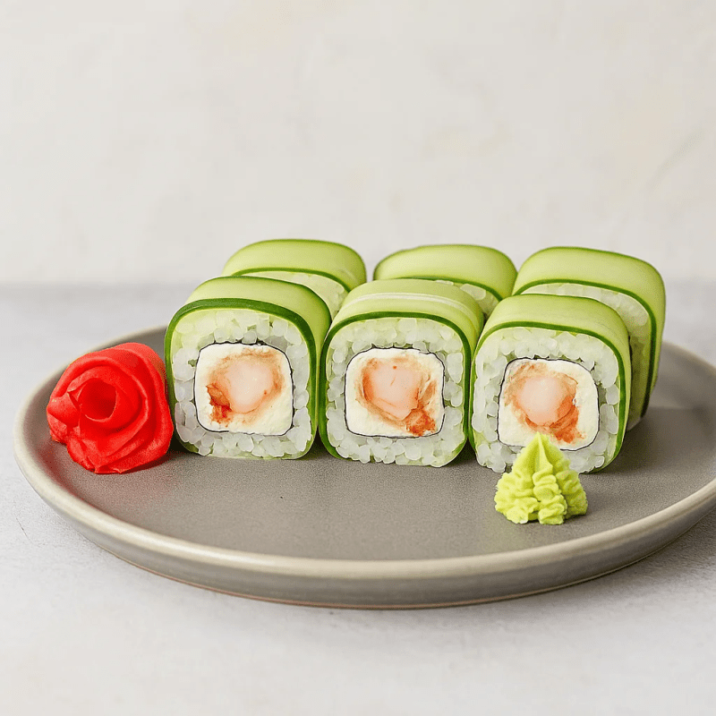 Состав: Рис, креветки, тобико, соус спайси, огурец